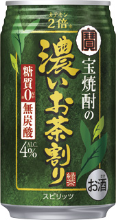 カテキン2倍の濃い味わいと渋みが楽しめる「宝焼酎の濃いお茶割り」です。“糖質ゼロ”で甘くなく、“無炭酸”と“ALC.4%”によるやさしい飲み口が特長です。